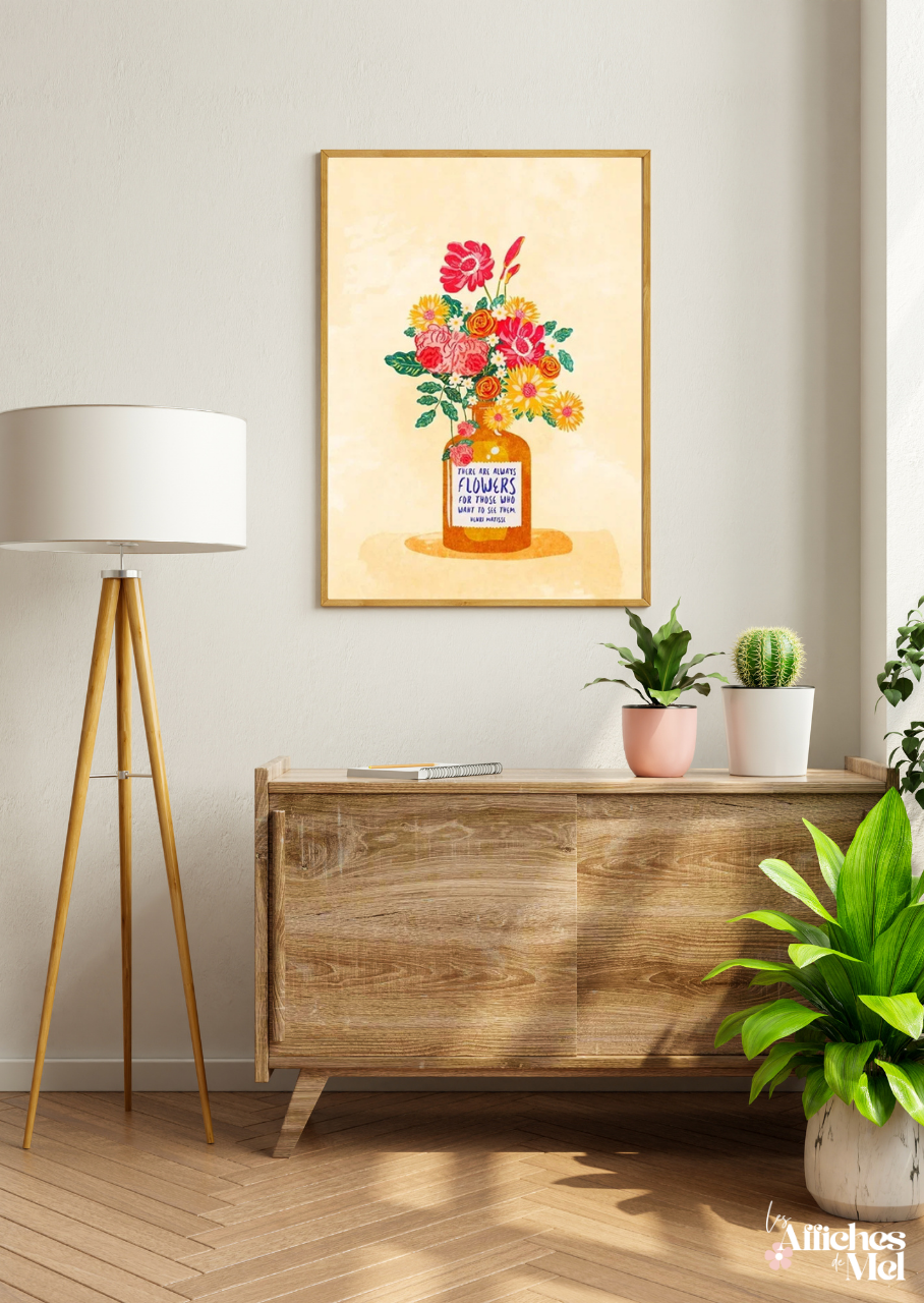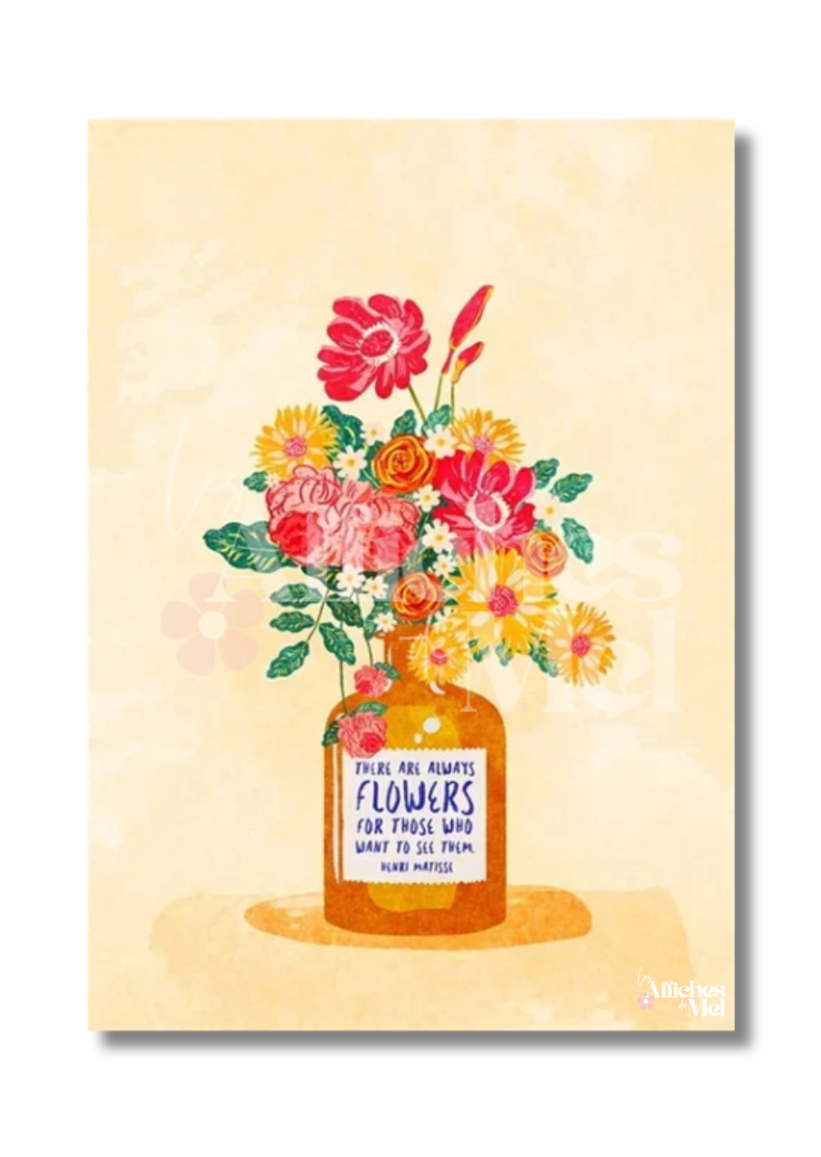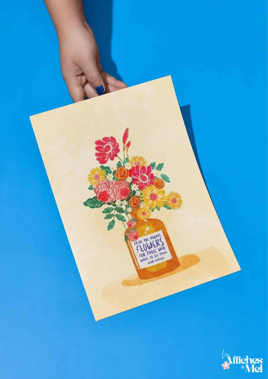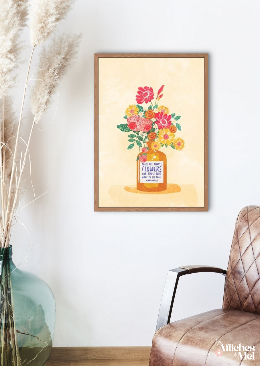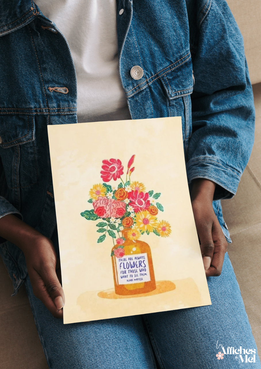 Illustrée d’un superbe bouquet de fleurs colorées dans un vase aux tons chauds, cette affiche met en avant une citation inspirante d’Henri Matisse :