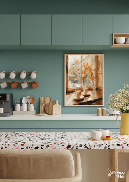 Plongez dans une ambiance chaleureuse et intime avec cette affiche style peinture représentant deux tasses fumantes posées devant une fenêtre.
