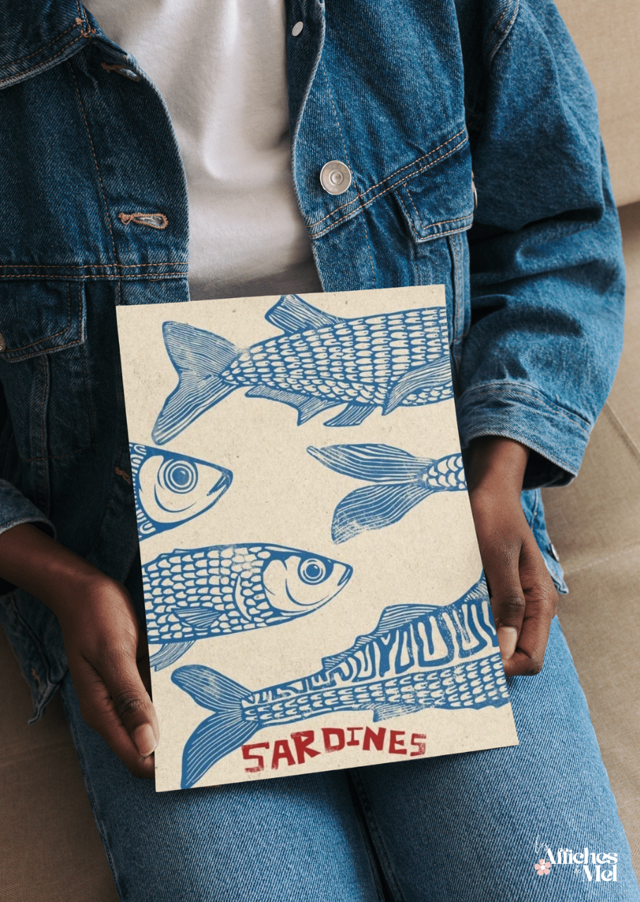 Le mot "Sardines" en typographie manuscrite rouge ajoute une note d’authenticité et de caractère.