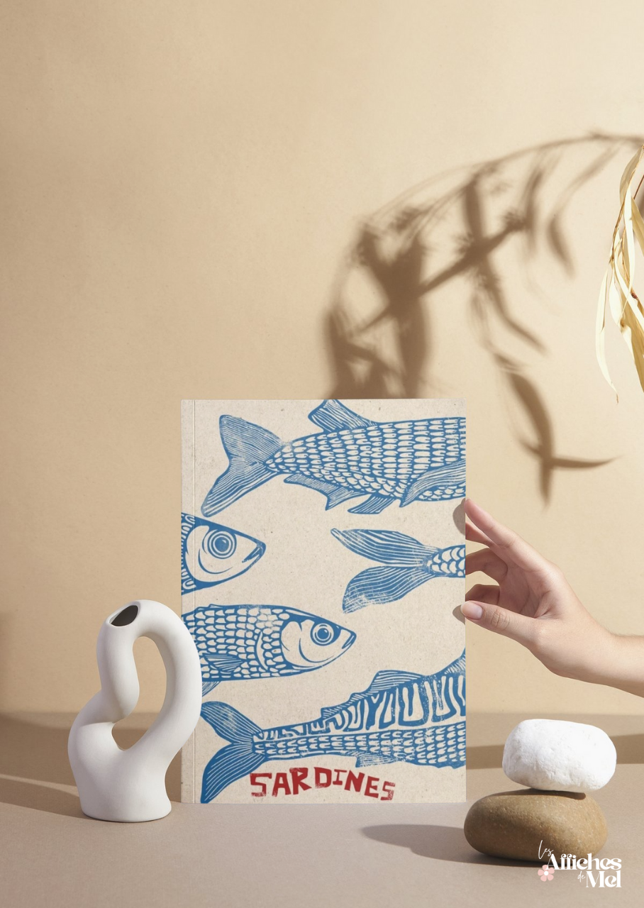 Affiche "Sardines" – Illustration Vintage Style Linogravure | Poster Cuisine ou Déco Murale Bord de Mer